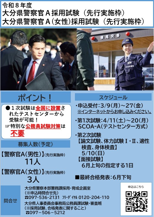 令和8年度大分県警察官A採用試験(先行実施枠)・大分県警察官A(女性)採用試験(先行実施枠)受験案内 ←こちら(PDF)