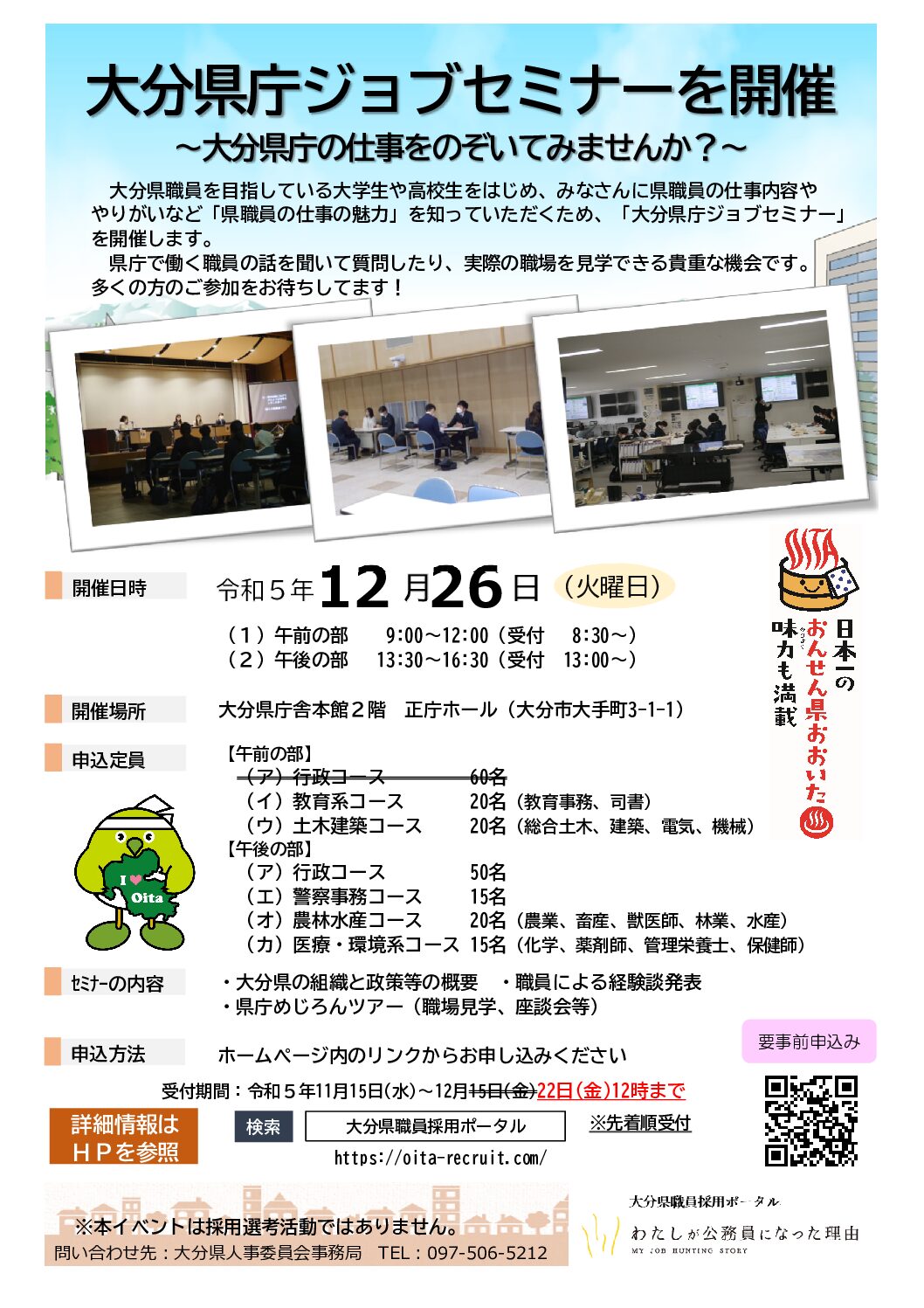 【申し込みは22日(金)12時まで!】12月26日(火)大分県庁ジョブセミナーを開催します!