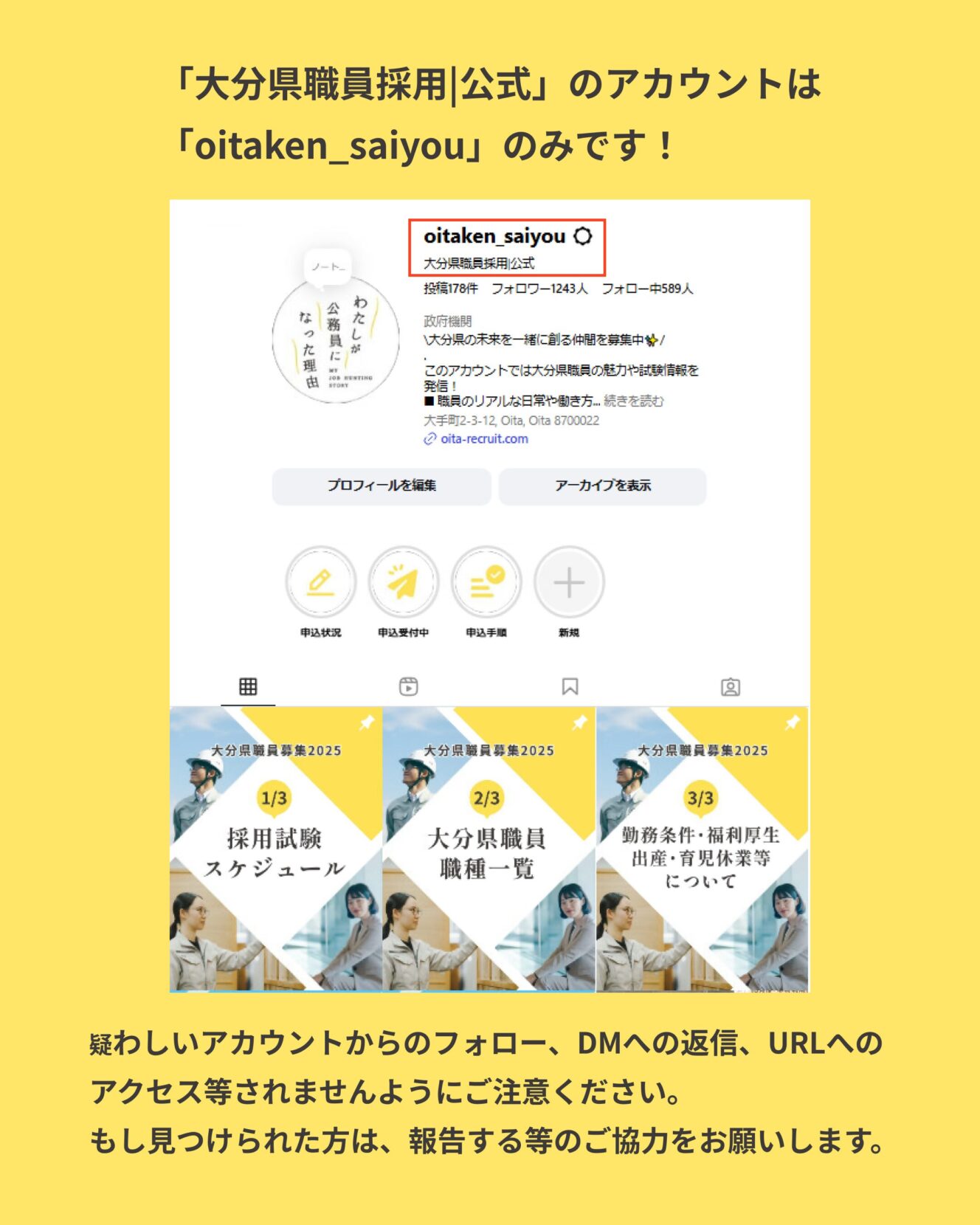 ■現在「大分県職員採用|公式」のなりすましアカウントが確認されています。